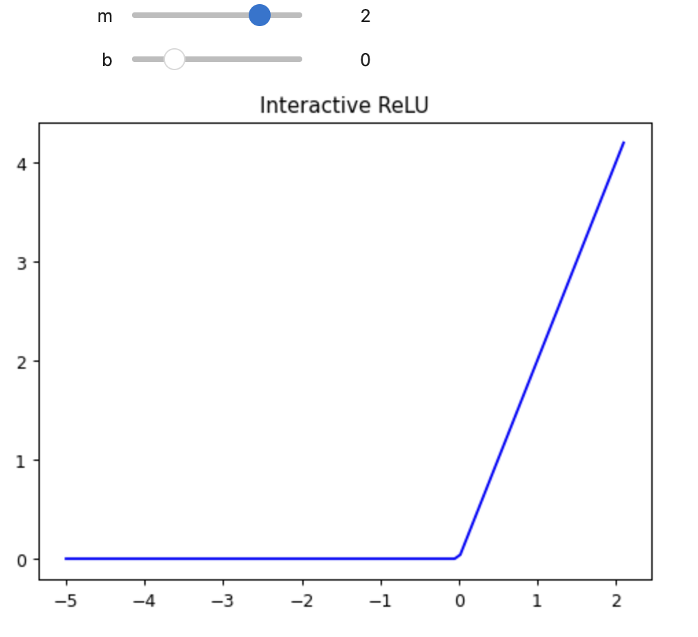 plot_function(partial(rectified_linear, m, b), title='Interactive ReLU', min = -5, color = 'b')